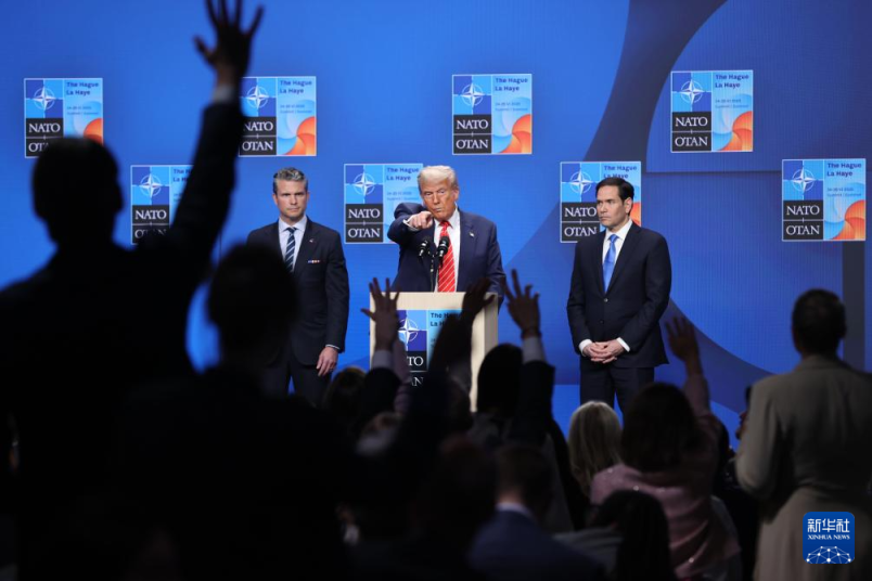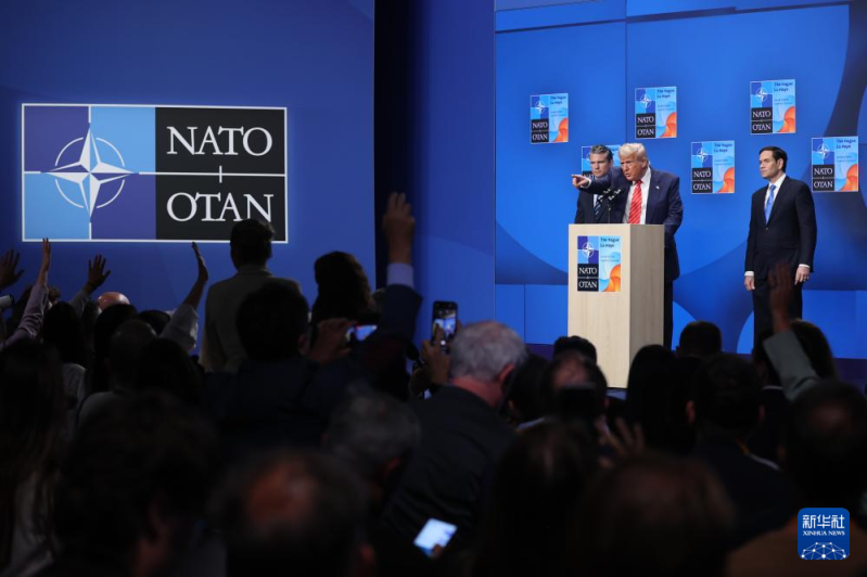 6月25日,在荷兰海牙,好意思国总统特朗普(前)在北约峰会后出席记者会。新华社记者 赵丁喆 摄
