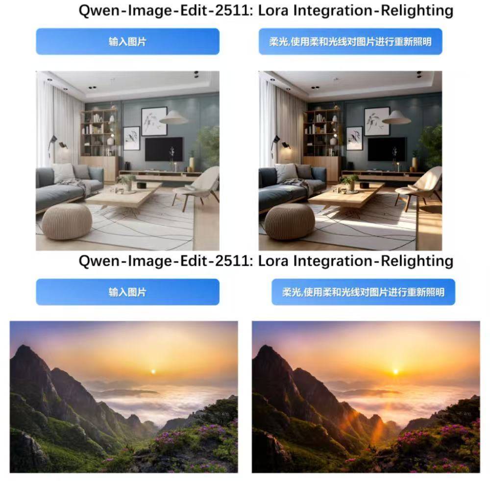 三、内置LoRA模子增强实用性,隐秘光照、视角与工业材质替换在Qwen-Image-Edit-2511中,官方初次将部分社区高频使用的LoRA子模子平直内置于基础模子中,用户无需加载尽头权重即可调用对应智商。这一机制权臣裁汰了LoRA功能的使用门槛,也栽培了模子在专科哄骗场景下的实用性。