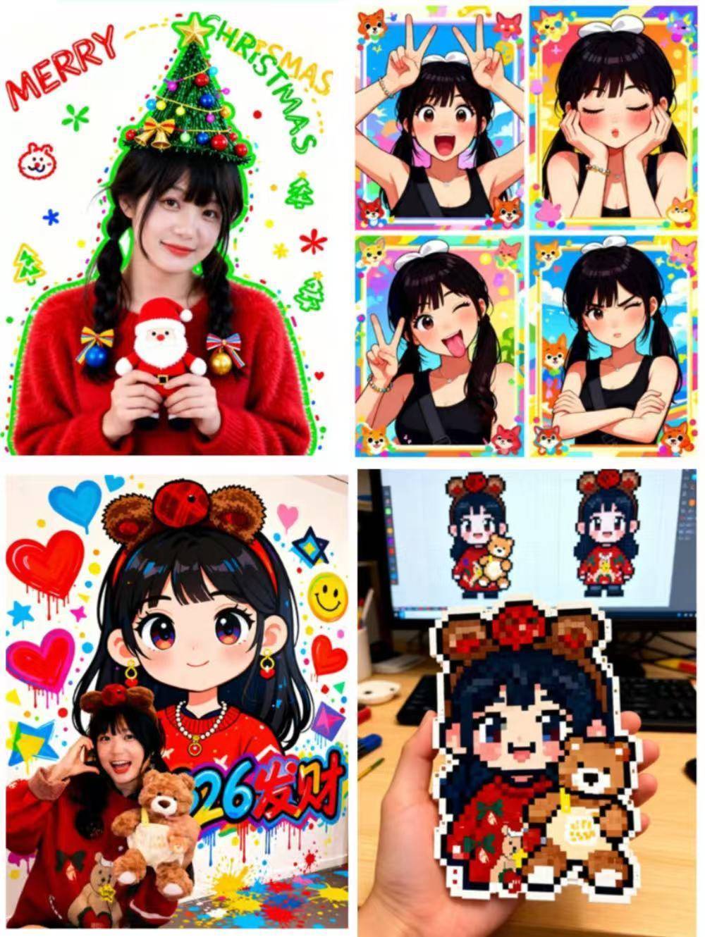 生成竖版3:4画面比例的“真东说念主与其对应卡通壁画合影”场景图像:将上传确凿切东说念主物像片以原样保留服装、发型、妆容置于画面左侧/前线,调整东说念主物的动作和拍摄视角,以确保画面和谐。在真东说念主背后墙面画图1:1对应卡通壁画,厚涂质感且取舍动漫气魄大眼、柔软轮廓五官,圆善复刻发型、服装及配饰细节如耳饰、项链等,颜色弥散度高并带有涂鸦式笔触服从。墙面添加彩色涂鸦爱心、笑脸图案元素,大地方缀飞溅格式遮挡细节,壁画区域融入如“2026新年景象”的中翰墨元素,字体气魄契合涂鸦好意思学。确保真东说念主与壁画比例、角度当然衔尾,光照概念协调相宜场景逻辑,保抓举座颜色气魄一致呈现灵活、连贯且视觉和谐服从。